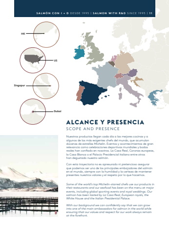 ALCANCE Y PRESENCIASCOPE AND PRESENCENuestros productos llegan cada d%u00eda a las mejores cocinas y a algunos de los m%u00e1s exigentes chefs del mundo, que acumulan docenas de estrellas Michelin. Eventos y acontecimientos de gran relevancia como celebraciones deportivas mundiales y bodas reales han confiado en nosotros. La Casa Real, Coronas europeas, la Casa Blanca o el Palacio Presidencial italiano entre otros han degustado nuestro salm%u00f3n.Con esta trayectoria no es apresurado ni pretencioso asegurar que podemos ser uno de los principales embajadores del salm%u00f3n en el mundo, siempre con la humildad y la certeza de mantener presentes nuestros valores y el respeto por lo que hacemos.Some of the world%u2019s top Michelin-starred chefs use our products in their restaurants and our seafood has been on the menu at major events, including global sporting events and royal weddings. Our salmon has been tasted by La Casa Real, European royals, the White House and the Italian Presidential Palace.With our background we can confidently say that we can grow into one of the main ambassadors for salmon in the world while ensuring that our values and respect for our work always remain at the forefront. SALM%u00d3N CON I + D DESDE 1995 | SALMON WITH R&D SINCE 1995 | 1 1HKSingapurUSDubai