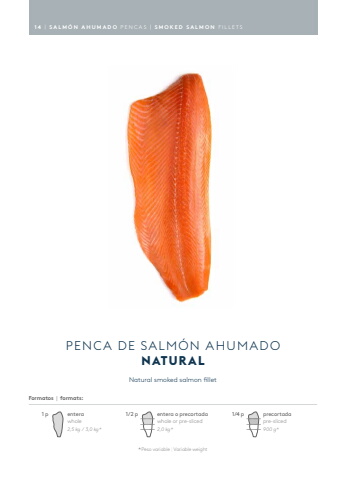 14 | SALM%u00d3N AHUMADO PENCAS | SMOKED SALMON FILLETSNatural smoked salmon filletPENCA DE SALM%u00d3N AHUMADONATUR ALFormatos | formats:* Peso variable | Variable weightenterawhole2,5 kg / 3,0 kg* 1 p entera o precortadawhole or pre-sliced2,0 kg* 1/2 p900 g* precortadapre-sliced1/4 p