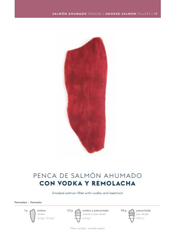 SALM%u00d3N AHUMADO PENCAS | SMOKED SALMON FILLETS | 1 7Smoked salmon fillet with vodka and beetrootPENCA DE SALM%u00d3N AHUMADOCON VODKA Y REMOLACHAFormatos | formats:* Peso variable | Variable weightenterawhole2,5 kg / 3,0 kg* 1 p entera o precortadawhole or pre-sliced2,0 kg* 1/2 p900 g* precortadapre-sliced1/4 p