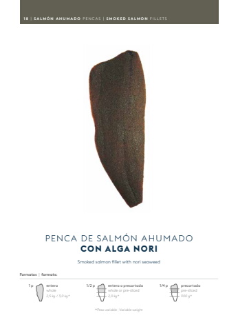 Smoked salmon fillet with nori seaweedPENCA DE SALM%u00d3N AHUMADOCON ALGA NORI18 | SALM%u00d3N AHUMADO PENCAS | SMOKED SALMON FILLETSFormatos | formats:* Peso variable | Variable weightenterawhole2,5 kg / 3,0 kg* 1 p entera o precortadawhole or pre-sliced2,0 kg* 1/2 p900 g* precortadapre-sliced1/4 p