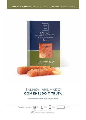 * Peso variable | Variable weightSmoked salmon fillet with dill and truffleSALM%u00d3N AHUMADOCON ENELDO Y TRUFAFormatos | formats: 150 g 150 g 400 g 1 kg*SALM%u00d3N AHUMADO LOS CORTES M%u00c1S NOBLES | SMOKED SALMON FILLETS | 2 9Sugerencia de corte | Suggested cuts