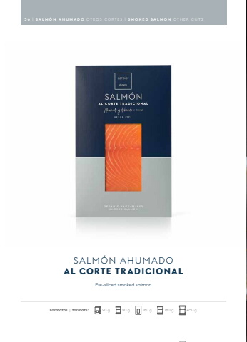 36 | SALM%u00d3N AHUMADO OTROS CORTES | SMOKED SALMON OTHER CUTSPre-sliced smoked salmonSALM%u00d3N AHUMADOAL CORTE TRADICIONALFormatos | formats: 90 g 90 g 180 g 180 g 450 g
