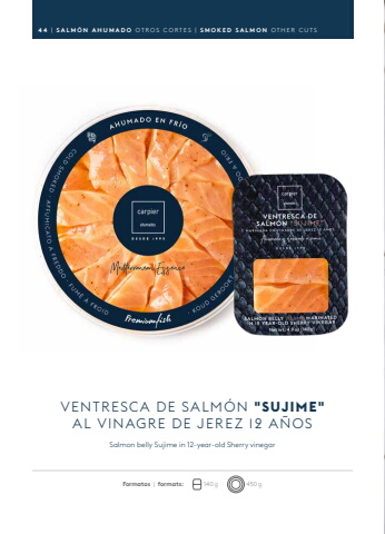 44 | SALM%u00d3N AHUMADO OTROS CORTES | SMOKED SALMON OTHER CUTSSalmon belly Sujime in 12-year-old Sherry vinegarVENTRESCA DE SALM%u00d3N \AL VINAGRE DE JEREZ 12 A%u00d1OSFormatos | formats: 140 g 450 g