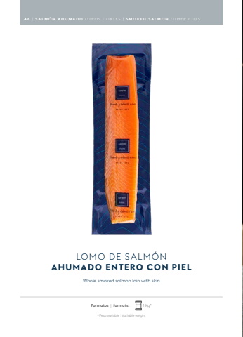 48 | SALM%u00d3N AHUMADO OTROS CORTES | SMOKED SALMON OTHER CUTSFormatos | formats:* Peso variable | Variable weightWhole smoked salmon loin with skinLOMO DE SALM%u00d3NAHUMADO ENTERO CON PIEL1 Kg*