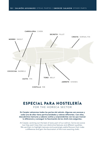 52 | SALM%u00d3N AHUMADO OTRAS PARTES | SMOKED SALMON OTHER PARTSJARRETE | SHANKSSECRETO | FILLETCARRILLERA | CHEEKCOCOCHA | BARBELSMORRO | SNOUTCRESTA | DORSAL FINALETA | FINTORO | BELLYCOSTILLA | RIBESPECIAL PAR A HOSTELER%u00cdA F O R T H E H O R E C A S E C T O R En Carpier valoramos todas las partes del salm%u00f3n. Algunas son escasas y cada una de ellas tiene particularidades y valores diferentes. Con ellas, descubrimos texturas y sabores sutiles y sorprendentes con los que marcar la diferencia y conseguir la fascinaci%u00f3n de los chefs m%u00e1s exigentes.At Carpier, we bring out the best of every part of our salmon. Some are scarce but they each have their own distinctive features and different qualities.We use them to highlight textures and surprisingly subtle flavours that make a difference and gain the fascination of the most exacting chefs.