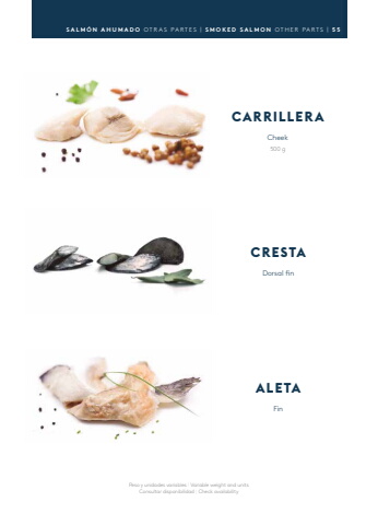 ALETAFinSALM%u00d3N AHUMADO OTRAS PARTES | SMOKED SALMON OTHER PARTS | 5 5Peso y unidades variables | Variable weight and unitsConsultar disponibilidad | Check availabilityCRESTADorsal finCARRILLERACheek500 g