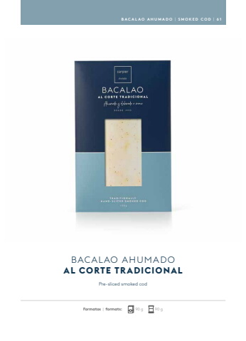 Pre-sliced smoked codBACALAO AHUMADOAL CORTE TRADICIONALFormatos | formats: 90 g 90 gBACALAO AHUMADO | SMOKED COD | 6 1