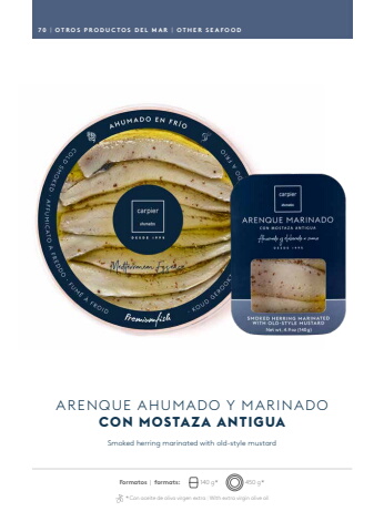 Smoked herring marinated with old-style mustardARENQUE AHUMADO Y MARINADOCON MOSTAZA ANTIGUAFormatos | formats: 140 g* 450 g*70 | OTROS PRODUCTOS DEL MAR | OTHER SEAFOOD* Con aceite de oliva virgen extra | With extra virgin olive oil
