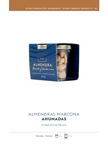 Formatos | formats: 60 g 500 gSmoked almonds MarconaALMENDRAS MARCONAAHUMADASOTROS PRODUCTOS AHUMADOS | OTHER SMOKED PRODUCTS | 8 9