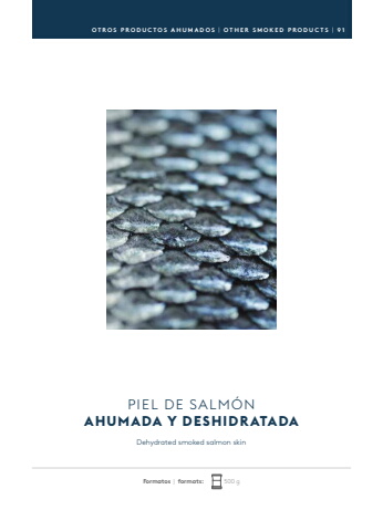 Dehydrated smoked salmon skinPIEL DE SALM%u00d3NAHUMADA Y DESHIDR ATADAFormatos | formats: 500 gOTROS PRODUCTOS AHUMADOS | OTHER SMOKED PRODUCTS | 9 1