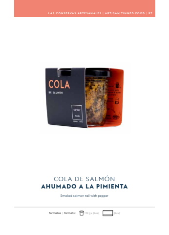 Smoked salmon tail with pepperCOLA DE SALM%u00d3NAHUMADO A LA PIMIENTALAS CONSERVAS ARTESANALES | ARTISAN TINNED FOOD | 9 7Formatos | formats: 110 g x (6 u) (6 u)