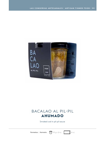 Smoked cod in pil-pil sauceBACALAO AL PIL-PILAHUMADOLAS CONSERVAS ARTESANALES | ARTISAN TINNED FOOD | 9 9Formatos | formats: 110 g x (6 u) (6 u)
